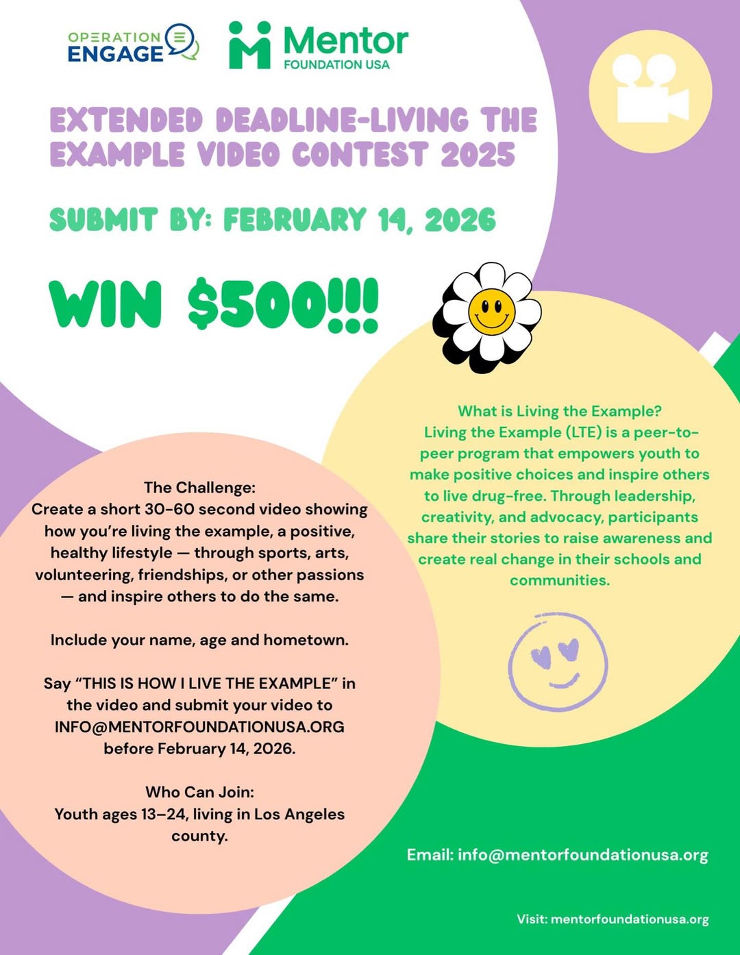 Mentor Foundation USA and DEA Operation Engage – Los Angeles have extended the ”Living the Example” video contest deadline to February 14th 2026 for your inspiring videos.